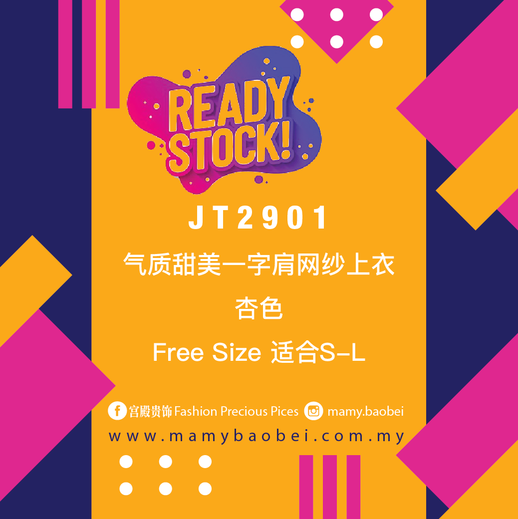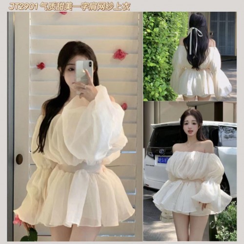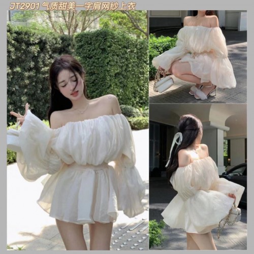 | Description | 《现货专卖场》JT2901 气质甜美一字肩网纱上衣 Sweet one-shoulder mesh top |