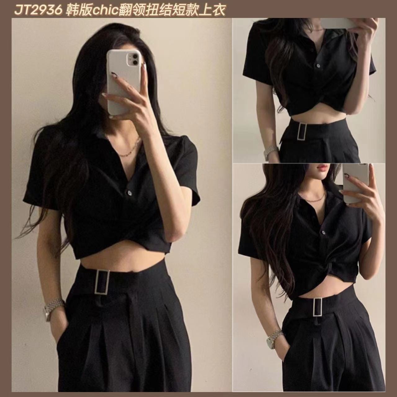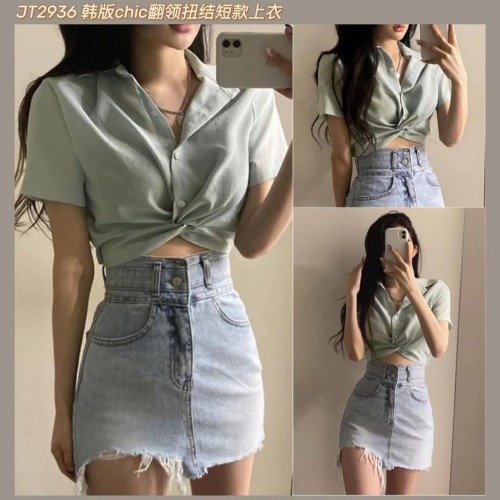 | Description | 《现货专卖场》JT2936 韩版chic翻领扭结短款上衣 Korean chic lapel twisted crop top |