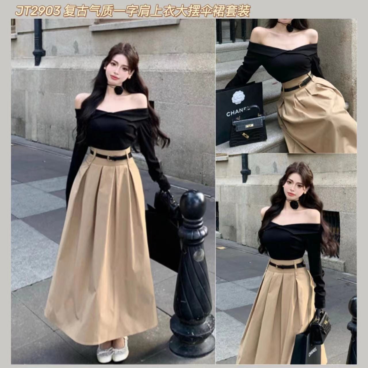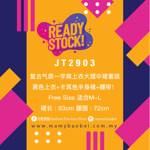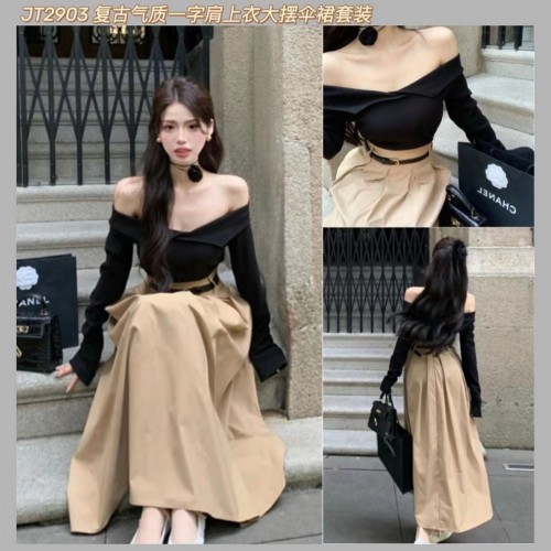 JT2903 复古气质一字肩上衣大摆伞裙套装 Ready Stock